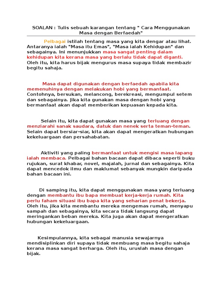 Karangan Cara Mengisi Masa Lapang Spm from zaskya-adyawebapp. CONTOH KARANGAN CEMERLANG. Masa ialah wang dan masa sangat penting kerana setiap individu hanya mempunyai dua puluh empat jam setiap hariUntuk menggunakan masa dengan sebaik-baiknya mungkin pengurusan masa dianggap sebagai cara yang terbaik sekaliPengurusan masa ialah kebijaksanaan membahagikan masa untuk menjalankan tugas.